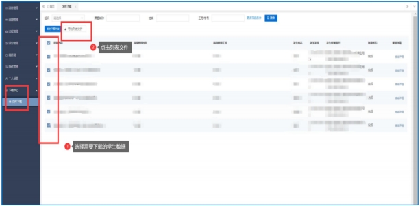 学生/教师用户按下图方式导出以下材料:各角色登陆系统之后,点击下载中心,选择需要下载的学生数据,点击导出列表文件-点击“导出选中”或“导出全部”选择需要下载的过程文件。