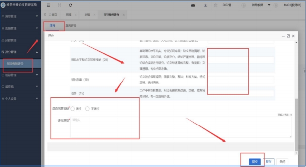 点击左侧菜单栏“评分管理”—“答辩稿指导教师评分”页面。 点击“评分”按钮,在弹出页面中对学生的答辩稿进行评分及评分意见的填写, 选择是否同意答辩。最后点击“提交”或“暂存”即可,“暂存”后成绩还可以进行 修改,不会提交到系统中;“提交”将成绩提交到系统中去进行总评的合算。
