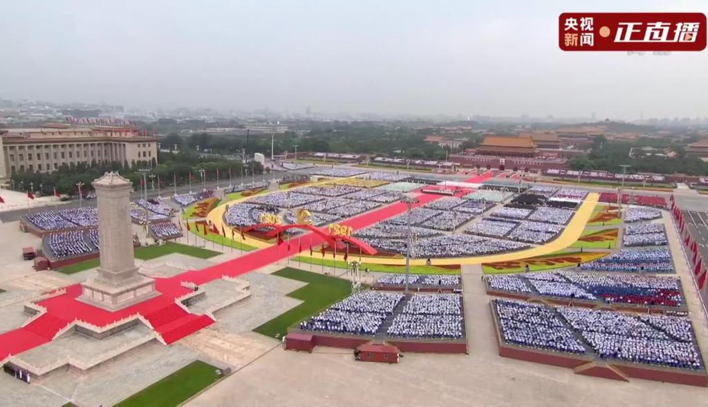 “伟大的中国共产党万岁!伟大的中华人民共和国万岁!伟大的中国人民万岁!全国人民大团结万岁!”空中护旗梯队悬挂党旗和巨幅标语飞过。