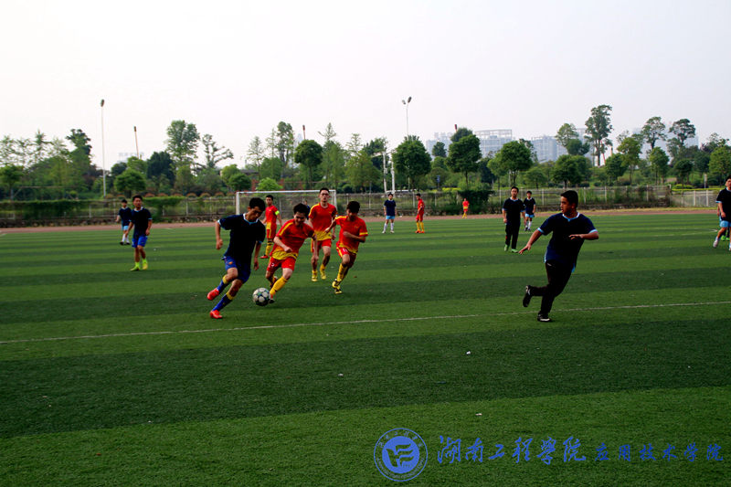 身着深蓝色球衣的是我院足球队,红色球衣的是建筑工程学院足球队。随着哨声响起,比赛正式开始。建工学院发球,双方球员迅速进入状态,前半场我院球员凭借出色的防守一次又一次阻止了对方迅猛的进攻,中后卫张赟、戴明尧,左后卫刘航、右后卫蔡熊死死的守住我方最后一道防线,门将郭浩东也凭借自己的实力打碎了对方几次射门,当然,我方前锋王斌,右边前卫罗嘉荣,左边前卫贺颖浩,中前卫谢志文,也再尝试着带球攻入对方禁区。双方将比分0:0尴尬的坚持到24分钟,24分钟,对方后卫失球出线,我院获得关键性角球一枚,关键角球,由我院足球队队长后腰王秋豪罚出,这时候我院双雄后腰的另一位绰号“费尔南多·托雷水”的19号文秋实在没有越位的情况下,抢到空挡,一脚将球送入对方门下,顺利终结上半场。下半场双方队伍交换场地,太阳西斜但并不影响球员们的斗志。开球后,建工队伍再次展开猛烈攻势,我院球员积极防守,又是“托雷水”,对方关键的一脚射门,19号球员文秋实纵身跃起,用腰挡下了对方关键的一脚进攻。啦啦队的呼声越来越高,比赛被推向了高潮,双方队员细腻的脚法、精彩的盘带,缜密的队形部署以及默契的配合博得场下观众的阵阵掌声。