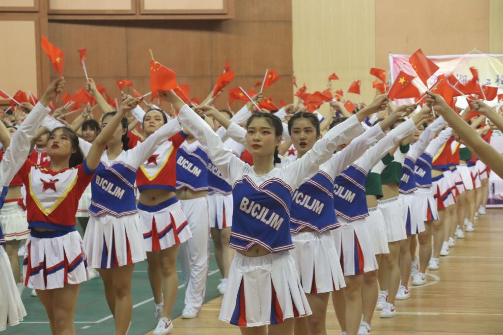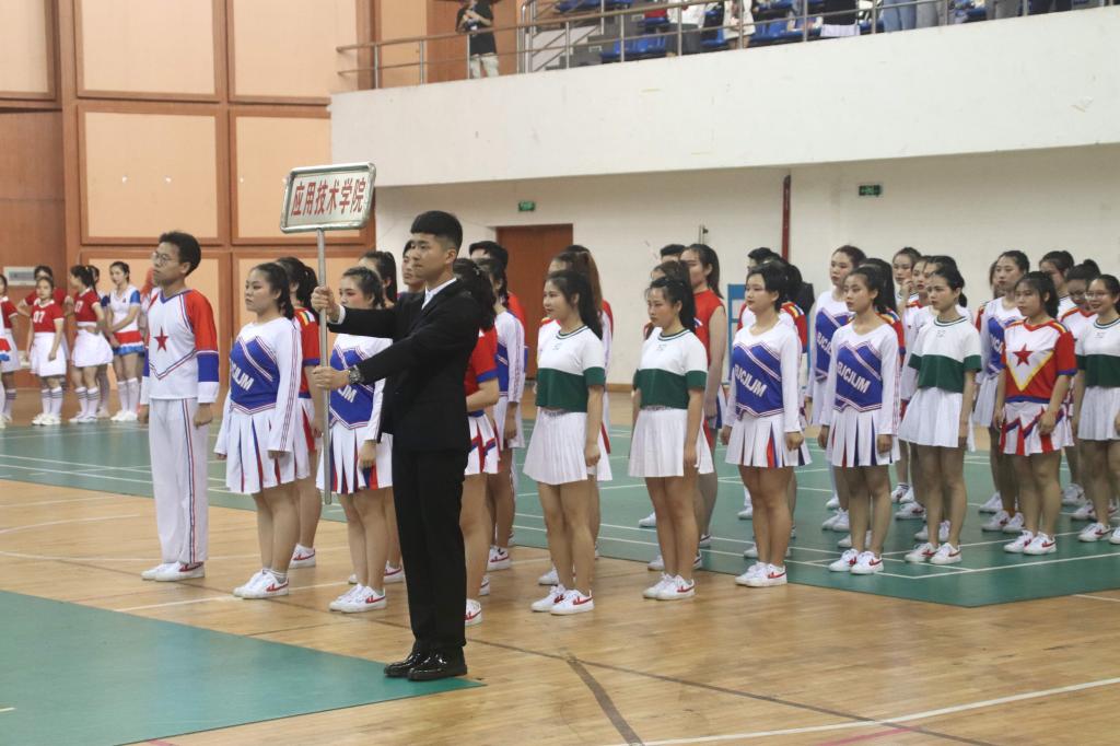 本次比赛共四个环节,各学院组成的十一支队伍参赛,按次序依次进场。我院代表队第八个入场,“应院加油”的口号响彻全场,选手们明快奔放的动作,鲜明的节奏感向大家展现了青春的激情,赢得了在场观众的热烈掌声和喝彩声。随后,伟的国际1946bv体育教学部周教授致开幕词。伴随着《我和我的祖国》的音乐响起,所有参赛队员挥舞着手中的小红旗,整齐划一的动作挥洒出青春的风采;各学院代表组成的队伍跳起欢快激情的藏族舞蹈,为祖国七十华诞献礼。