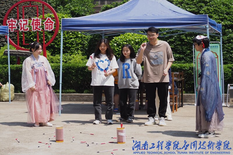 走进第一教学楼大厅,书法协会正以书法展正的形式,展现着书法这一传统文化的独特魅力,陈列的十六幅书法作品引得路过的学生驻足欣赏。走出第一教学楼,古风曲艺社的场地上,数位身着汉服的女子映入眼帘,手执一把团扇,如诗如画。投壶、传统知识竞答、苏绣教学三个游戏同时开展,红绿的精美丝线在细薄的扇面上来回穿梭,一朵小花便在扇面上绽放开来。大批传统文化爱好者纷纷上前挑战知识问答,一问一答间尽现文化传承。