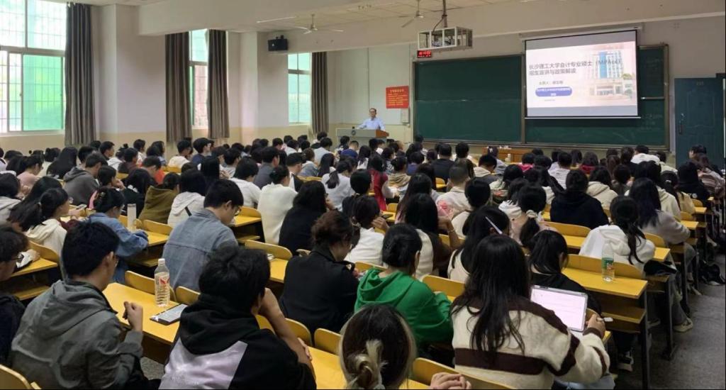 为进一步浓厚学院考研氛围,帮助更多同学更好地了解2025年研究生招生政策,10月15日下午,长沙理工大学经管学院谢志明教授应邀来我院开展会计学专业硕士(MPAcc)招生政策宣讲会。学院大三、大四年级160多名学生参加宣讲会。