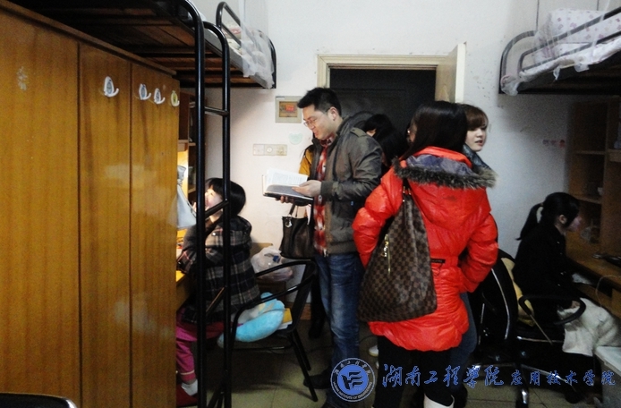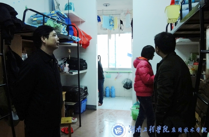 宿舍卫生和大功率电器的使用是检查的重点,检查组在每间寝室提醒同学们,要注意用电安全,不要私拉乱接电线。春季要勤于打扫卫生,勤于开窗,通风换气,杜绝室内抽烟,以免影响自身健康。院领导和同学们就学习和生活中的问题进行了亲切的交谈,认真听取了同学们反映的意见。李光中指出,检查的目的是为了解同学们的学习环境,督促大家的学习,希望大家在大学四年里把握时间,有所收获。彭栋梁书记要求大家培养良好的生活习惯,提高学习和工作能力素养。徐粤宇副书记叮嘱同学们不要浪费青春,要有目标的学习。因近来天气异常,他们还要同学们注意保暖,适当增减衣物,以免生病而影响学习。同时他们还督促同学们要以学习为中心,扎扎实实的打好基础,为将来的进一步发展做好铺垫,希望同学们在新的学期中取得优异的成绩。