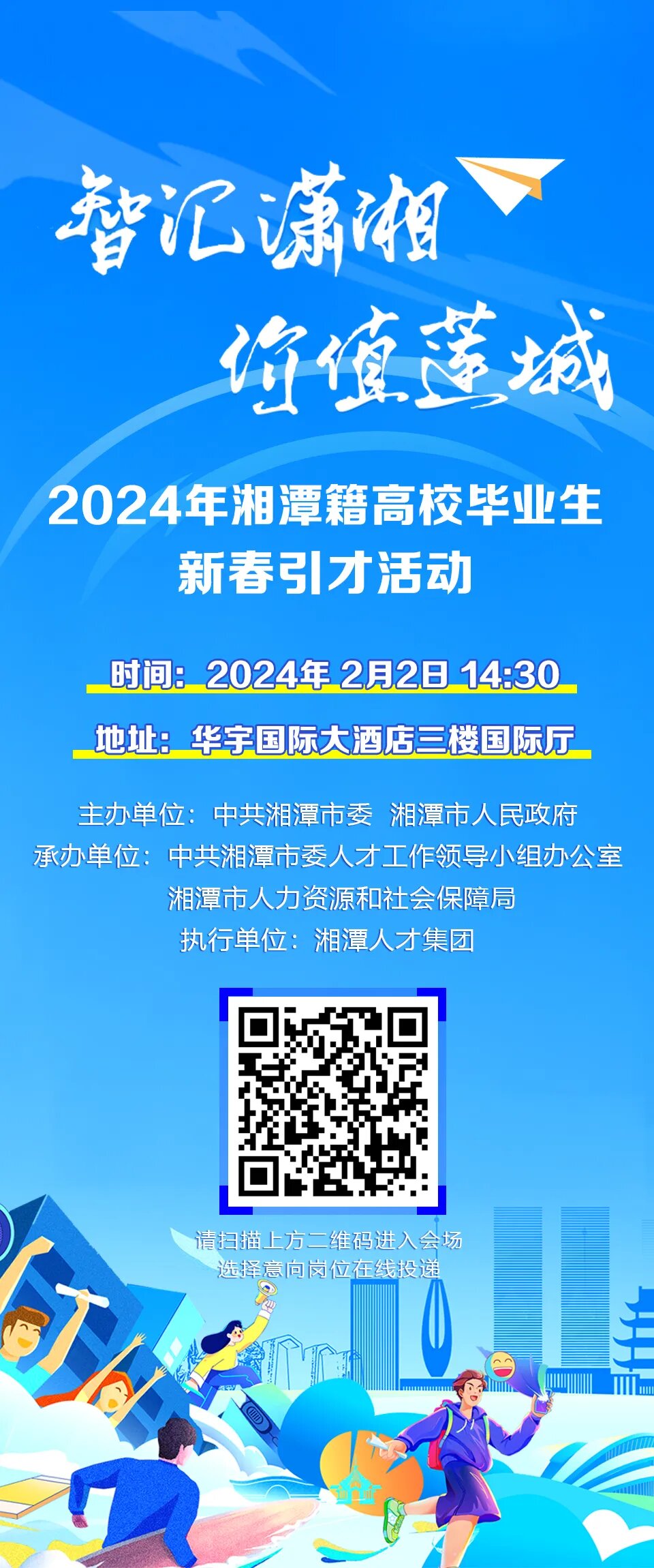 为深入贯彻党的二十大精神和中央、省委人才工作会议精神以及省委书记沈晓明来潭调研的安排部署,坚持稳中求进总基调,完整、准确、全面贯彻新发展理念,着力做好优秀人才储备,进一步拓宽人才引进渠道,加大优秀人才储备,重点引进一批湘潭籍优秀青年人才,结合春节大学生返乡契机,我市定于2024年2月2日(星期五)组织在潭高校、事业单位和重点企业举办2024年“智汇潇湘·价值莲城”湘潭籍高校毕业生新春引才活动。