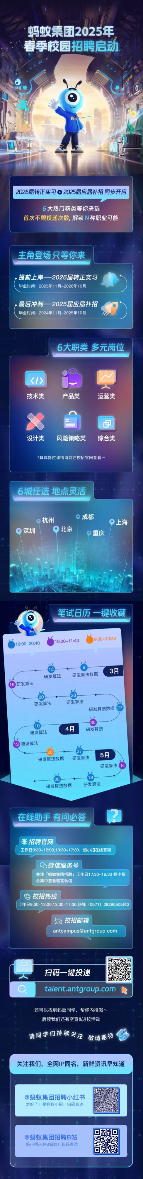 蚂蚁集团(支付宝(杭州)信息技术有限公司)蚂蚁集团2026届【转正实习】2025届【应届补招】已于2025年3月3日上午十点正式启动,欢迎贵学院有意向同学加入!