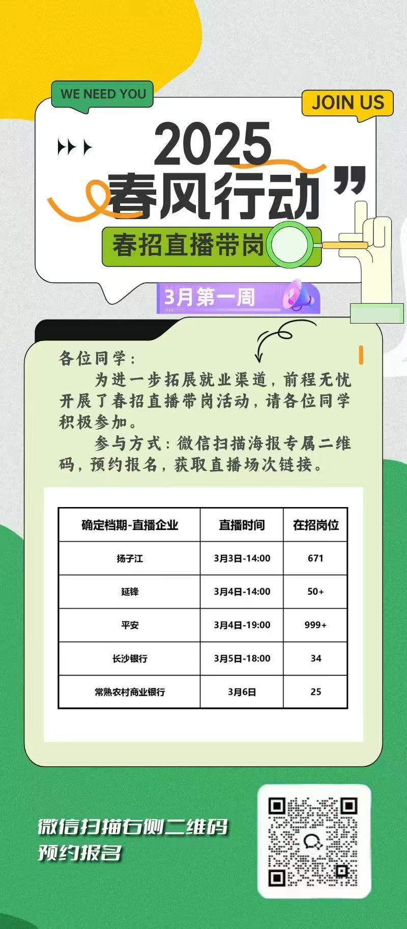 各位同学:为全面贯彻落实党中央、教育部关于促进高校毕业生就业工作的决策部署,切实做好毕业生就业工作,进一步拓展就业渠道,我校联合前程无忧开展了“春招直播”带岗系列公益活动,请各位同学积极参加。参与方式:微信扫描海报专属二维码,预约报名,获取直播场次链接温馨提示:此次活动为公益活动不收取任何费用。请大家重视起来,积极报名参加,预祝大家都能找到自己理想的岗位!