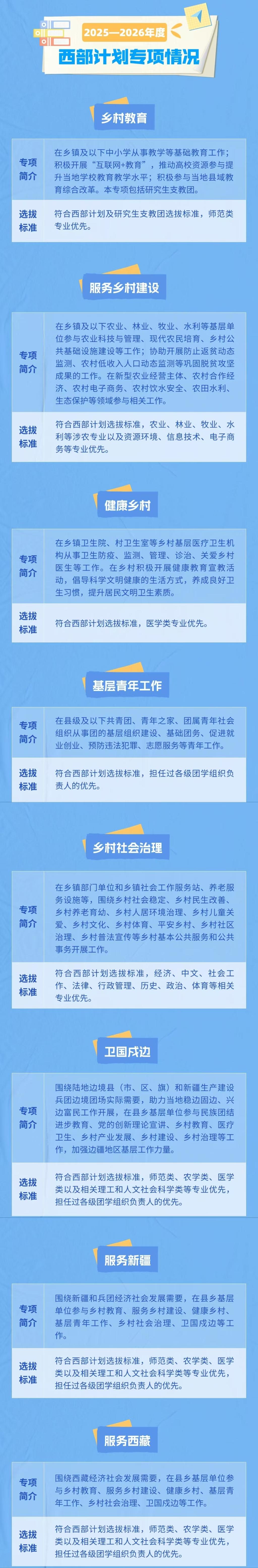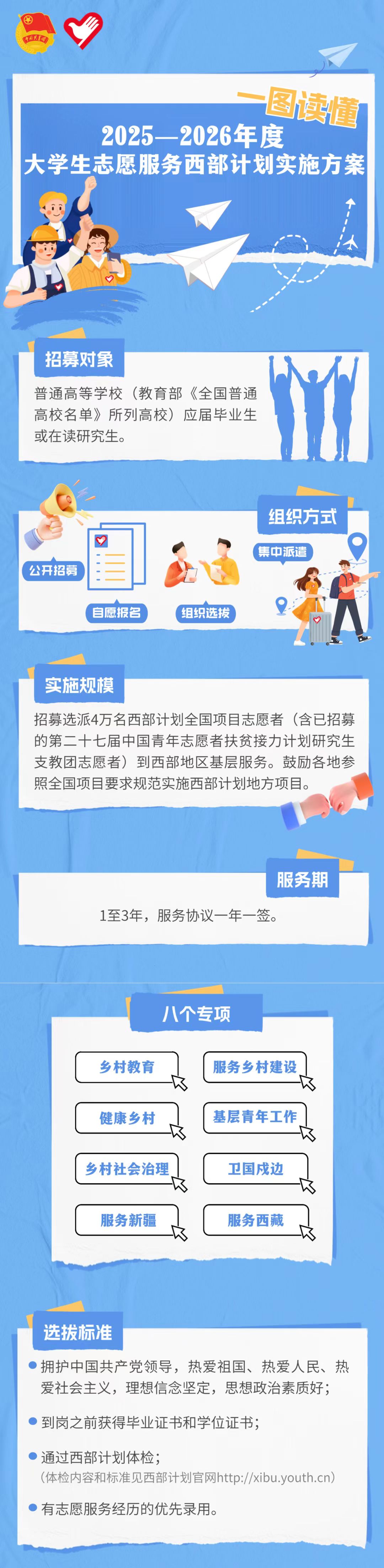 3月1日至5月10日,2025年普通高等学校应届毕业生或在读研究生,可通过微信公众号“西部志愿汇”(菜单栏中的“我要报名”)或登录西部计划官方网站(http://xibu.youth.cn),在西部计划报名系统中注册报名。
