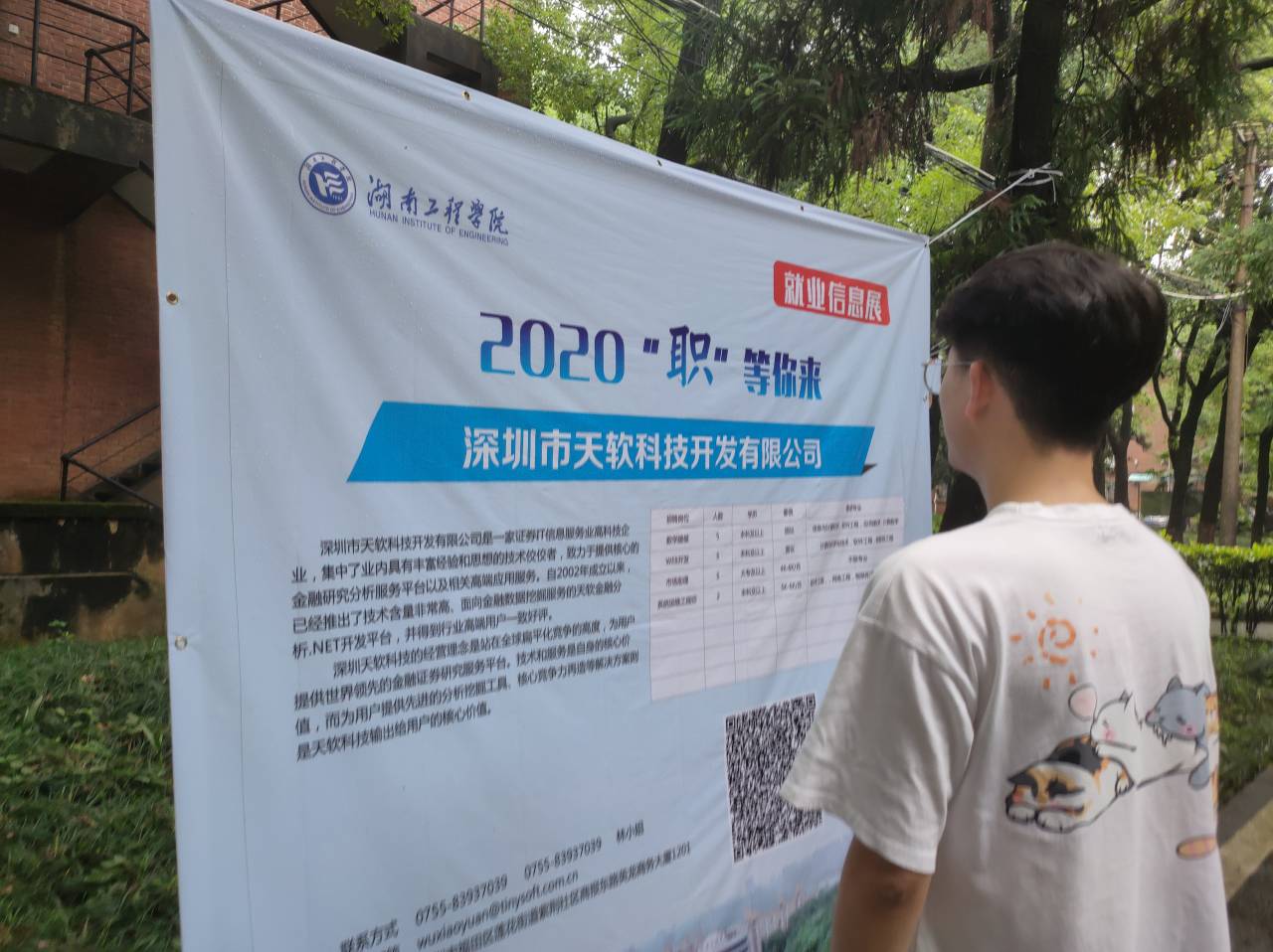 毕业生离校在线招聘会将于6月8日开启,就业信息展汇正在进行。本次就业信息展汇集了学校招就处、校友办公室、学院自己联系的重点企业60家,共1000余个岗位,涵盖了bv1946伟德国际始于英国所有专业。布展充分利用南校区校园大树成荫、间距合理的优势,在学生宿舍、食堂前以及两者的必经通道两旁,通过大幅海报的对招聘企业的基本概况、招聘岗位、薪资水平等信息进行介绍,吸引了不少毕业生驻足查看,扫码投递简历。