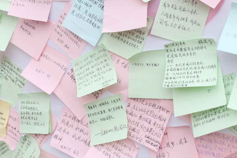 活动在青春蓬勃的团歌中走向尾声,最后,学生们在心愿墙上写下自己的青春寄语和对祖国的美好祝愿。