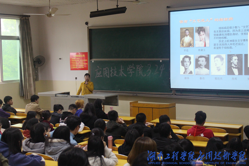 为进一步落实我院结核病防控工作,加大结核病防控知识宣讲普及力度,增强学生对结核病防控意识,纪念第24个世界防治结核病日,湘潭市岳塘区疾病预防控制中心原结核科科长旷友君于4月2日下午2:30在第一教学楼313教室举行“结核病防控知识”主题讲座,各班学生代表参加。