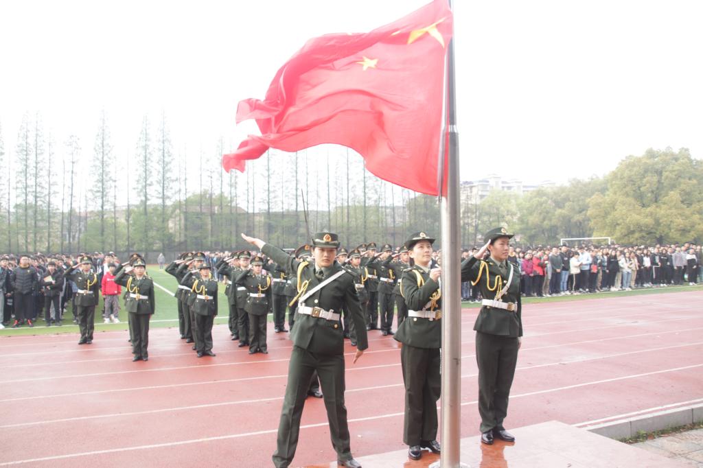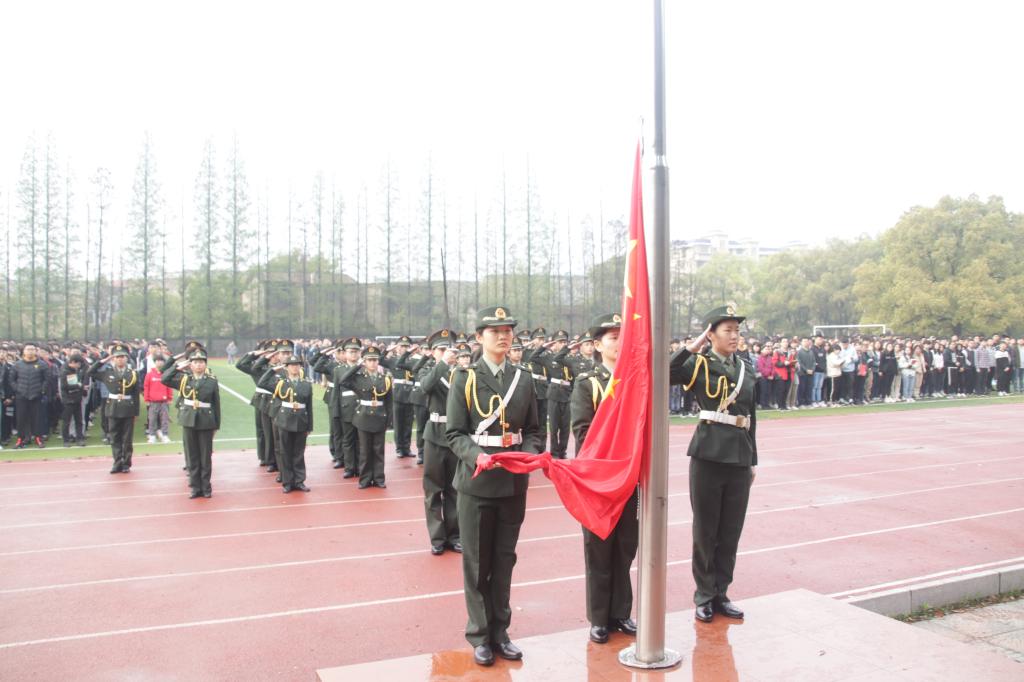 唐冰宣布升旗仪式开始,国旗护卫队迈着铿锵有力的步伐,护送五星红旗于升旗台。伴随庄严的国歌声,五星红旗冉冉升起,全体师生共唱国歌。