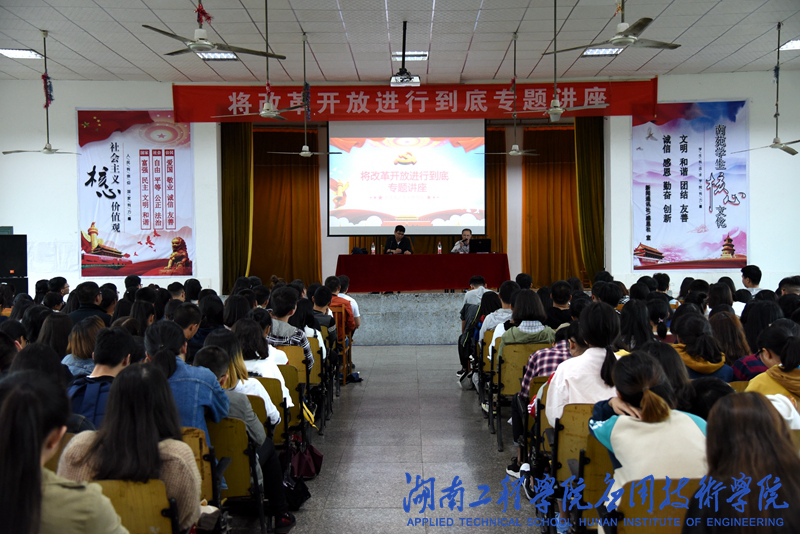 10月9日下午2:50,庆祝改革开放四十周年专题讲座《将改革开放进行到底》在南校区第一教学楼四楼活动中心举行。讲座由我校副校长李军林主讲。bv1946伟德国际始于英国院长李光中、党总支书记李爱国、党总支副书记徐粤宇、学办全体辅导员、班主任、全院学生党员和干部以及设计艺术学院学生代表参加。
