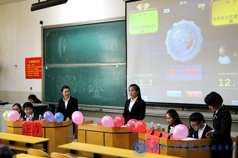 12月16日下午3:00,由我院学生会学习部主办的第二轮辩论推广赛在南校区一教313举行,此次辩论赛的辩题为:当代社会更需要冷头脑还是热心肠。我院党总支副书记徐粤宇、学生工作办公室主任刘红石、团总支书记唐冰、学生辅导员孙传旺、曹时艳担任评委。辩论队副队长易灵知担任主持人。