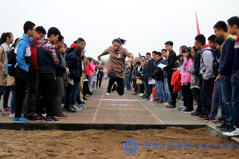 伴随着进行曲的奏响,参赛选手们热身、试跳,个个摩拳擦掌毫不示弱,这气氛让人紧张又激动。跳远沙坑的两侧围绕着的拉拉队员,使欢呼声加油声围绕着这个比赛场地,也给了选手们更大的信心。我院选手龚婷与刘珊以十分优秀的成绩从预赛中脱颖而出。龚婷个头不高,但小小的身躯里蕴含着超强的爆发力。一段稳健的助跑之后,一、二、三,她身体前倾,腾空跃起。伴随着此起彼伏的惊呼声,她以9.13米的优异成绩夺取了冠军。赛她表示,以前高中的经历给予她良好的基础,让她即使有点小紧张也能发挥得如此好,同时拿到这个名次她很兴奋,也很满意这次的成绩,希望下次取得更加优异的成绩。