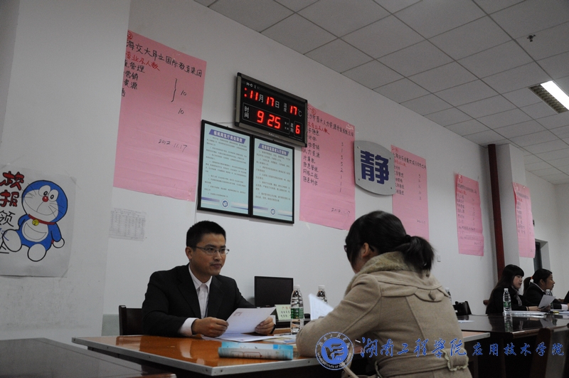 见面会还未开始,应聘者便手持简历早早来到现场,积极与招聘人员进行交流。招聘人员对我院准毕业生的个人素质和综合能力给予了充分的肯定,并告诫同学们一定要做好人生的定位,有目标才有方向的择业。