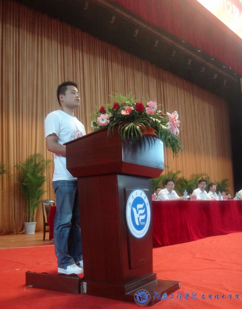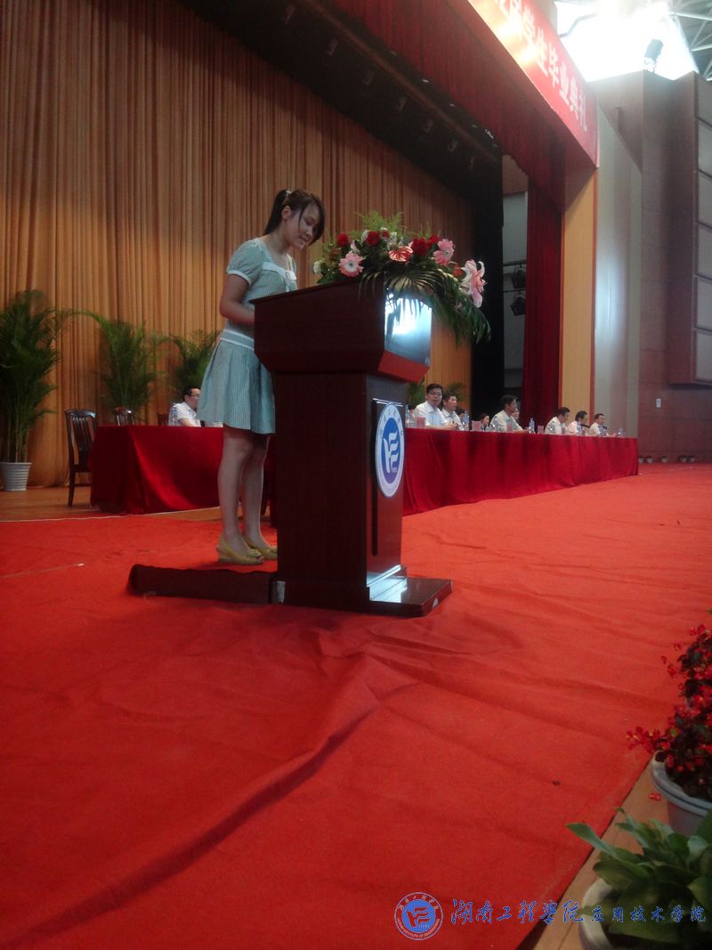 2012届毕业生代表王会生在台上发言,他把最诚挚的敬意和最衷心的感谢献给谆谆教诲的恩师以及朝夕相伴的同学。张垄水作为在校生代表向毕业生送上了最真挚的祝福——祝他们越走越远,越走越好。