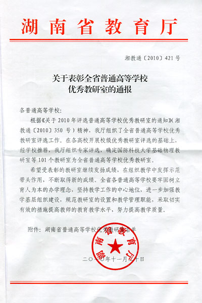 近日,湖南省教育厅发布了《关于表彰全省普通高等学校优秀教研室的通报》(湘教通[2010]421号),我院电气工程及其自动化教研室等101个教研室被评为全省普通高等学校优秀教研室,并受到表彰。