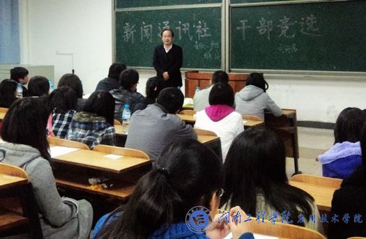 12月2日晚7:00,我院学生新闻通讯社换届选举大会在新校区D-101举行,副院长文山东、办公室主任张宏、团总支书记缪智文以及学生会主席李靖靖、团总支书记助理周杰同学担任了本次选举大会的评委,学生新闻通讯社全体干部及新老干事准时出席,为当晚的竞选者加油。