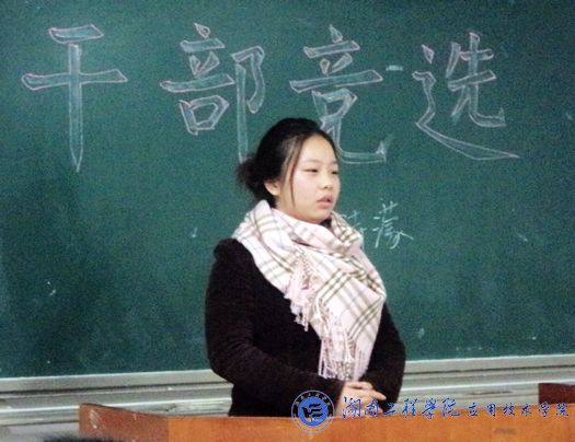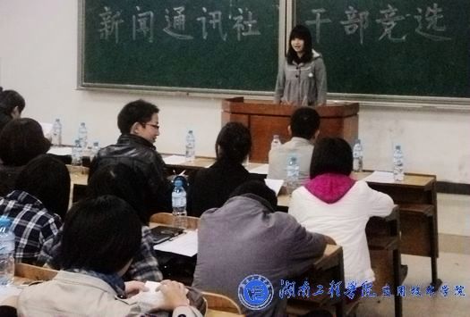 竞选分为两个环节:竞选人自述和评委提问。自述环节,大家准备的都比较充分,无论是对过去工作的总结、成绩的表述还是就任后的打算,在台上都能镇定自若,徐徐道来。这其中,也出现了此次竞选环节里最温馨的一幕:记者团副主任李赞和专题部副主任王婷主动放弃竞选,把宝贵的机会让给了其他成员。而最精彩、最悬念、最动人心弦的要数摄影部主任蒋艳与记者团主任刘娅子的社长之争。先上台的是蒋艳,在一段自我介绍后,她便谈起任职后的打算,将会从责任心和管理两个方面入手,对学生新闻通讯社进行整顿提高。其充分的准备、妥善的计划得到了评委们的点头称赞。而刘娅子也是自信满满、成竹于胸,面对评委们的提问也是对答如流。对于评委提出如何提升学生新闻通讯社,其更显睿智,她说:我希望加强与湘潭大学、湖南科技大学这两个兄弟学校学生新闻通讯社的交流合作,在互相取经的同时构建一个交流平台,增加学校学生间的联系交流。蒋艳和刘娅子两人的工作态度和能力都是有目共睹的,一个稳扎稳打、深思熟虑,一个雷厉风行、干脆利落,两人一时瑜亮,让评委难以取舍。