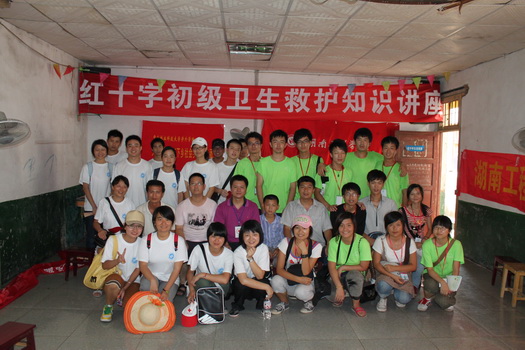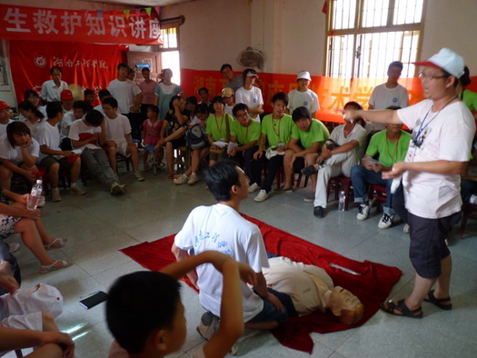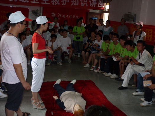 7月21日下午3:00,在双江中学体育教学部,娄底市红十字会刘洁、马婷等五位工作人员作了“红十字初级卫生救护知识讲座”。我院、中南林业科技大学涉外学院以及湖南人文科技学院三所高校“三下乡”社会实践志愿服务团成员,还有当地部分村民,认真听取和观看了红十字工作人员两个小时的声情并茂的讲解和示范,同学们都纷纷欲试。第一位上台为我们做心肺复苏术救护示范的是来自我院的任波涛同学,在他熟练地操作下,我们再次领略了心肺复苏术救护的全过程。继而,其他两所高校的同学也纷纷上台练习示范。同学们的精彩演讲和熟练操作,得到了五位红十字工作人员的一致好评。