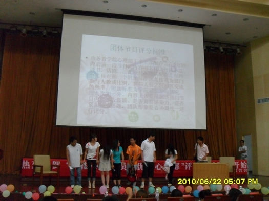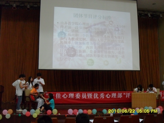 6月22日下午3:00,学校“十佳心理委员暨优秀心理部”评选活动在主校区(新)图书馆一报告厅举行。经过各学院心理咨询部门的集体节目表演、心理健康知识问答和心理委员们的工作交流等三个环节之后,我院学生会心理咨询中心被评为学校“优秀心理部”。