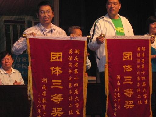 10月18~19日湖南省第十四届高等学校英语演讲比赛在郴州湘南学院举行,英语0682班黄思佳、旅游管理0681班张敏、人力资源0681班杨利微三位同学代表我院参加了本科二组的比赛,并取得了本科二组团体三等奖优异成绩,同时黄思佳同学和张敏同学还获得了个人单项三等奖的好成绩。