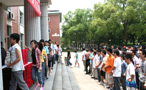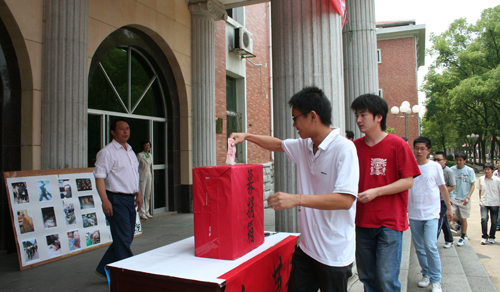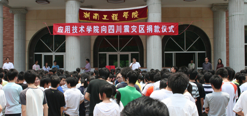 5月14日中午12点30分,我院南校区1000多名学生聚集在一教学楼前坪,排着整齐的队伍,认真听取成平副书记的动员讲话。讲话刚一结束,学生党员、学生干部马上走在最前面进行自愿捐款,10元、20元、100元、200元不等。一位名叫朱冬冬的女同学拿出2000元放进了募捐箱。当老师问她,“你为什么捐这么多?”她腼腆地回答到:“四川发生了这么大的天灾,我们全家都很难过,我父母来电话询问我们学校是否在组织捐款,并建议我和我的弟弟分别在学校要多捐一点,尽量为灾区的老百姓多一点支持,多一份关爱。”多么憨实的话语,多么深情的善举。天灾无情,人间有情,一方有难,八方支援。一笔笔捐款,一颗颗爱心,饱含着我院南校区1000多名学生的深情厚谊。