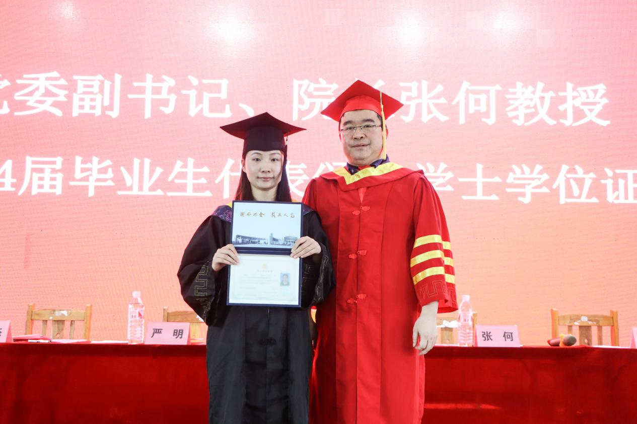 闵杰宣读《关于授予bv1946伟德国际始于英国2024届毕业生学士学位的决定》后,隆重的颁发学位证书环节正式开始。伴随着激扬的音乐,毕业生代表一一上台,张何为2024届毕业生代表扶正流苏,颁发学位证书,并合影留念。