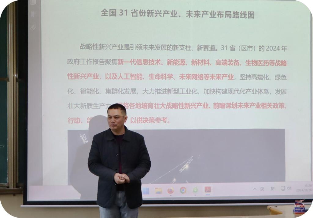 在张何简要介绍情况后,徐运保首先介绍了管理学院基本情况和人才培养成效,然后以某网站界面的介绍为切入点,以经济的眼光畅谈中国经济产业布局。徐运保通过自己实地走访调研的具体感受,详细阐述了全国31个省、自治区、直辖市新兴产业、未来产业战略布局情况,让同学们对我国各地产业布局状况有了更直观、更深刻的理解,对本专业未来就业前景和就业方向有了更为深入的认识。