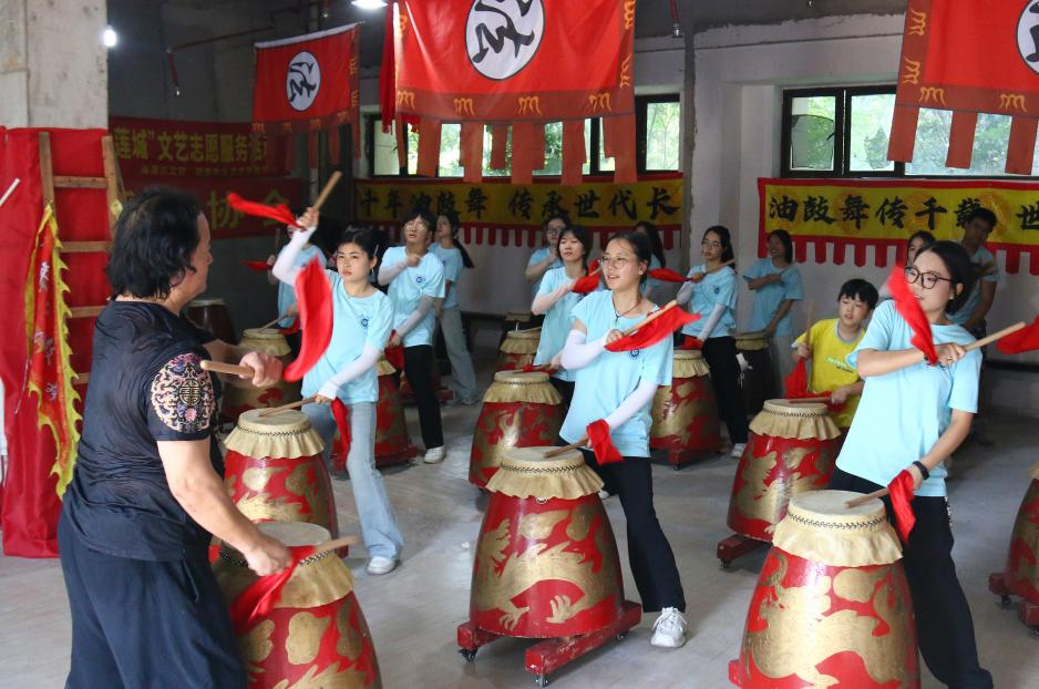 在千年油鼓(舞)展览馆,打油鼓第十代传承人钱继明为志愿者们介绍了湘潭非遗文化打油鼓的悠久历史,分为迎神派、巫舞派和龙舟派。梳头、洗面、照镜……志愿者们拿起鼓槌,在钱继明的指导下学习击打节奏。当“十字步”的步伐与鼓点精准契合,莲蓬鼓舞在年轻身影的演绎下焕发出新的生机,庆祝丰收时“咚哒咚哒”的欢庆鼓点,生动说明了非遗不是博物馆里的静态展品,而是可触摸、可传承的“活态文化”。
