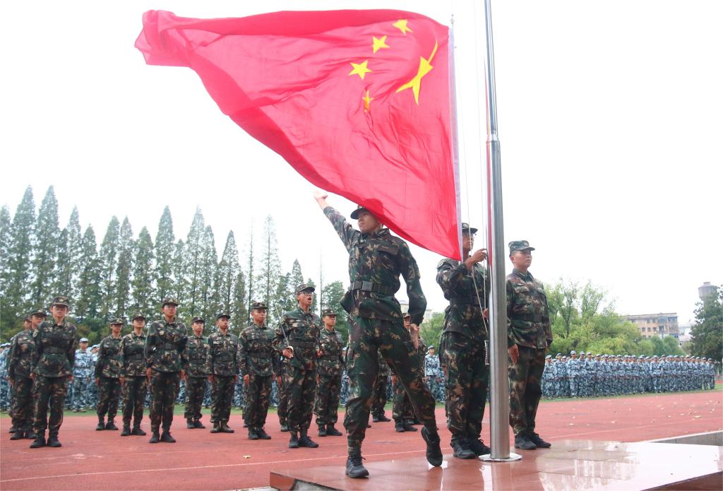 七点,仪式正式开始。护旗手们精神抖擞,迈着整齐有力的步伐,护卫五星红旗走向升旗台。随着激昂的《义勇军进行曲》奏响,升旗手奋力挥臂,将国旗展向天空。全体人员整齐列队,神情庄重,高唱国歌,向国旗行注目礼。升旗仪式后,总营长尹亮带领大一新生回顾了九一八事变那段惨痛的历史,他握拳高呼,号召大一新生不怕苦累,坚持完成军训,践行先辈的奋斗与奉献精神。