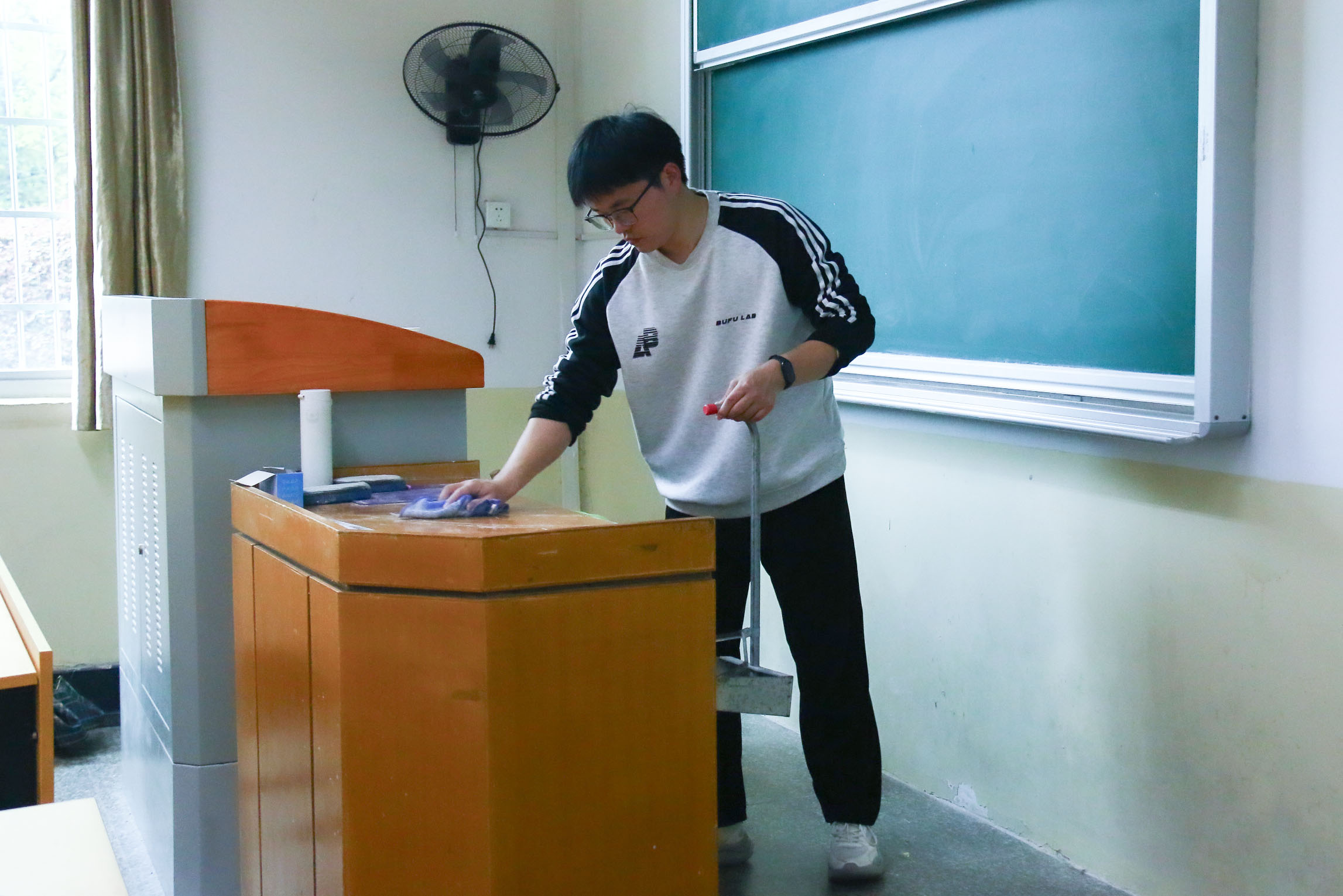 本次主题党日意在学生党员立足实际,在服务师生中锤炼党性、强化担当,具体活动内容为全体党员分组前往一至四教学楼开展校园卫生清扫志愿服务。党员们手持清洁工具,分工协作、认真细致,对教室地面、黑板、讲台、门窗及卫生死角进行全面清理,努力营造整洁舒适的教学环境。活动中,大家充分发扬不怕苦、不怕累、不怕脏的奉献精神,以实际行动践行 “为人民服务” 宗旨,用实干诠释为师生服务的承诺,成为校园中一道靓丽的风景线。